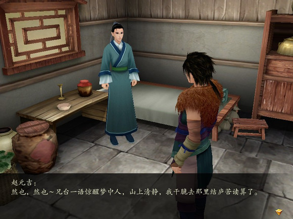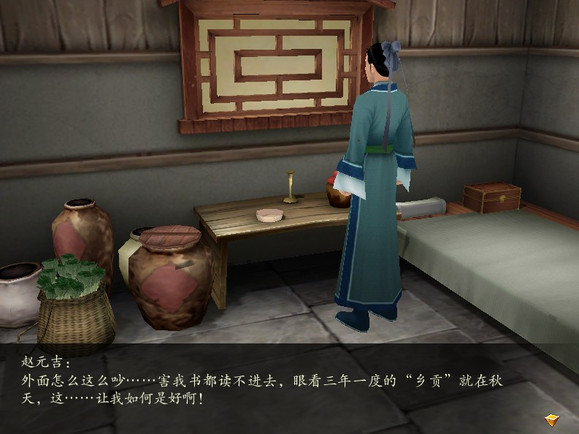文字版—————————————————————————————————————赵元吉:外面怎么这么吵……害我书都读不进去,眼看三年一度的“乡贡”就在秋天,这……让我如何是好啊!云天河:热闹不好吗?山上没这么多人,也就没意思了~赵元吉:然也,然也~兄台一语惊醒梦中人,山上清静,我干脆去那里结庐苦读算了。—————————————————————————————————————中期来的时候会发现这货作为NPC又回来了—————————————————————————————————————赵元吉:唉,我七次赶考,七次都未能中秀才,难道真的与功名无缘?—————————————————————————————————————后期的对话变更—————————————————————————————————————赵元吉:一生为墨客,几世作茶仙~既然考不上功名,就在此地当个茶仙也不错。—————————————————————————————————————看起来是讲的追求功名屡败的书生逐渐看开了的故事。