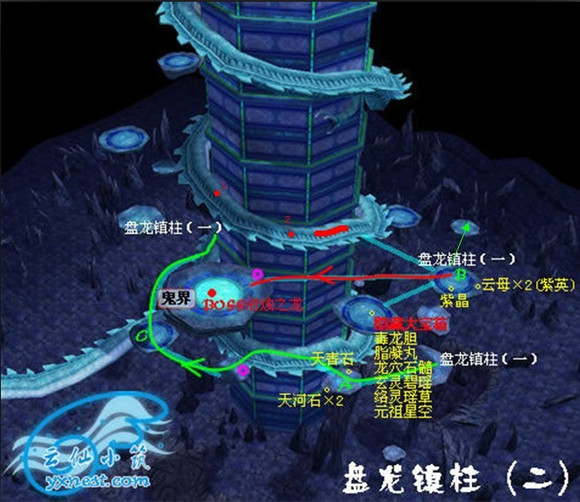 [/img] 具体的情况来拉近景XD摆地图摆LOGO在到达打龙台之前的到达的这个台子(绿色的B标注处)是重点XD这个台子接了四块浮版其中一块是来的方向(绿色箭头标注)另三块的通向可以从地图中看到。这里不就讨论去隐藏大宝箱的那个了。这三块,左边的通向打龙台,右边的是来路,中间的通向龙道