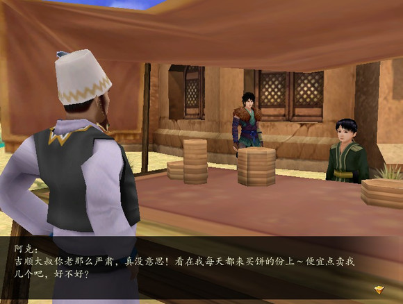 ④播仙大饼摊初到播仙。靠近大饼摊,就是"食"处。文字版————————————————————————————————吉顺:卖大饼啦~香喷喷的大饼出炉啦!不香不收钱啦!阿克:哇!太好了!大叔~来十个不香的!吉顺:阿克你又来捣蛋!再胡闹我就告诉你娘!阿克:吉顺大叔你老那么严肃,真没意思!看在我每天都来买饼的份上~便宜点卖我几个吧,好不好?吉顺:好说好说,你别胡闹就成~云天河:……便宜卖?不懂……————————————————————————————————总之就是播仙善良的大饼老板好大叔和活泼爱捣乱小孩子以及依然杯具的天河XD吉顺大叔作为"食"的老板是没有普通对话的...这里是委托的介绍和交任务时的对话————————————————————————————————"沙依木那姑娘上山求仙去啦!临走还特地买了我摊上的大饼,真是……认识她那么久了,我怎么好意思收这么多银钱?小兄弟,帮我把这些钱送还给沙依木他娘吧,她就在车马驿上面葡萄架的附近。你愿意帮我送去吗?"吉顺:哈哈,谢谢兄弟你帮忙,这些手抓饭和奶茶可是播仙镇上的一绝,送你一些,带在路上吃,保证比你们中原人干巴巴的面饼好吃!————————————————————————————————阿克小正太的————————————————————————————————阿克:吉顺大叔卖的饼味道是最好的,就是有点贵~哈哈。阿克:沙依木姐姐说她要去仙山了,娘送给她很多好吃的带在路上~她长得那么漂亮,又聪明,天神一定愿意留下她做自己的仆人。阿克:沙依木姐姐从仙山上回来了,仙人不愿意收她做仆人,也不让她继续待在山上……姐姐她好伤心……阿克:天神先是不让沙依木姐姐待在山上,现在又收回了清澈的河水……我们到底做错了什么事,天神要这样惩罚我们?————————————————————————————————还是很和谐的小镇一隅啊~